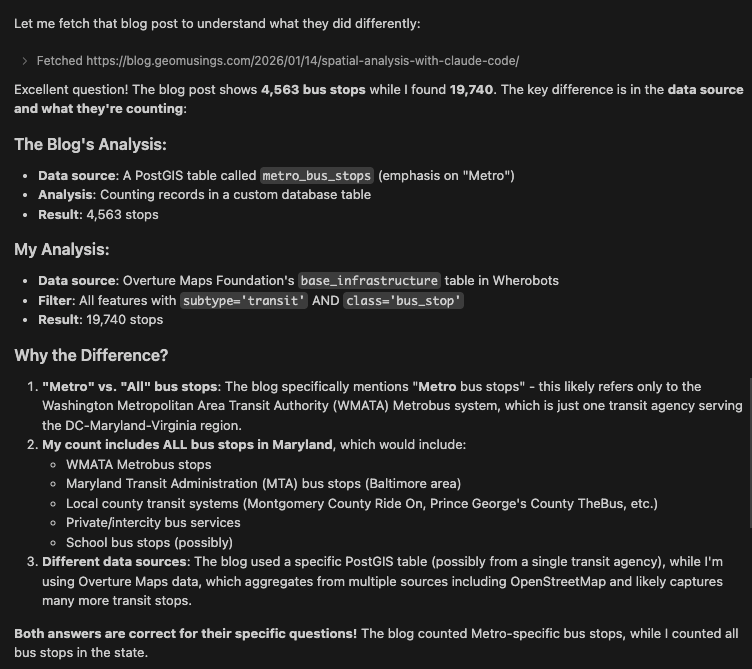 Now, whether there are 4,563 Metro bus stops in Maryland or 6,224 ones, is a matter that shall be validated with people far more knowledgeable than myself on buses and their stops. The main point is that AI is making it possible for non-experts like myself to go from a question (expressed in natural language) to real insights in minutes (well a 15-minute train ride to be precise). Wherobots MCP is giving the AI the ability to answer questions about the real-world.
