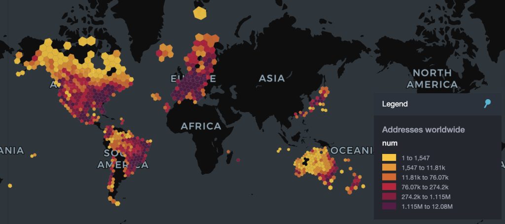 address_h3 = sedona.sql(""" -- Generating H3 cells at zoom level 2 WITH address_ww AS ( SELECT *, ST_H3CellIDs(geometry, 2, false) as h3 FROM wherobots_open_data.overture_maps_foundation.addresses_address ), -- Generating polygons representing H3 indexes, group data by the H3 index, -- and counting how many data entries belong to each H3 index. address_h3 AS ( SELECT COUNT(*) AS num, ST_H3ToGeom(h3)[0] as geometry, h3 FROM address_ww GROUP BY h3 ORDER BY num DESC ) -- Finally shifting longitude for the polygons that cross the International Date Line SELECT num, h3, CASE WHEN ST_CrossesDateLine(geometry) = true THEN ST_ShiftLongitude(geometry) ELSE geometry END AS geometry FROM address_h3 """)