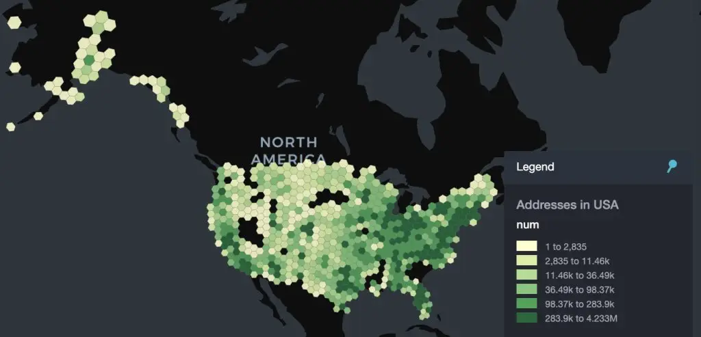 The visualization reveals gaps in data coverage, likely due to privacy regulations in certain states or the absence of addresses in specific areas: