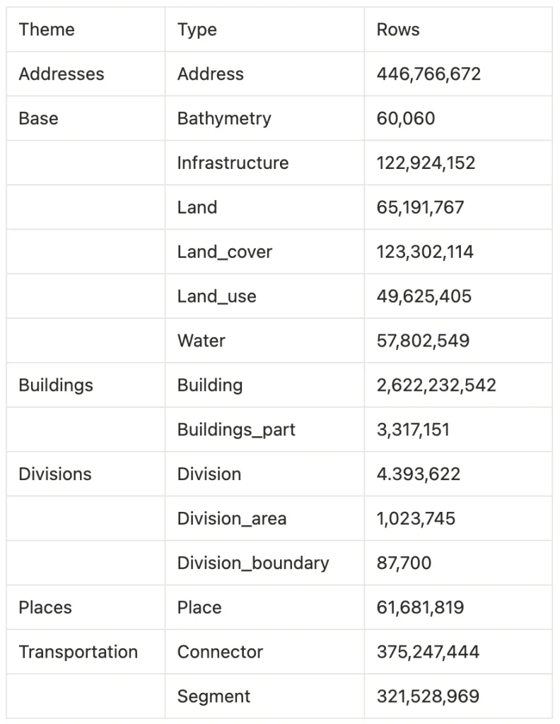 Overture organizes its datasets into distinct themes, each containing various types. The structure of these themes and types is as follows: