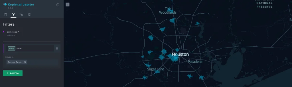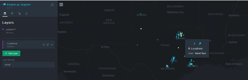We’ve retrieved the latitude and longitude of our locations, as well as the name of the chain each location belongs to. We used the CASE WHEN statement in our query in order to simplify the location names. This way, we can easily select all the stores from the Torchy’s Tacos chain, for example, and not have to worry about individual locations being called things like “Torchy’s Tacos – Rice Village” or “Velvet Taco Midtown”, etc.
