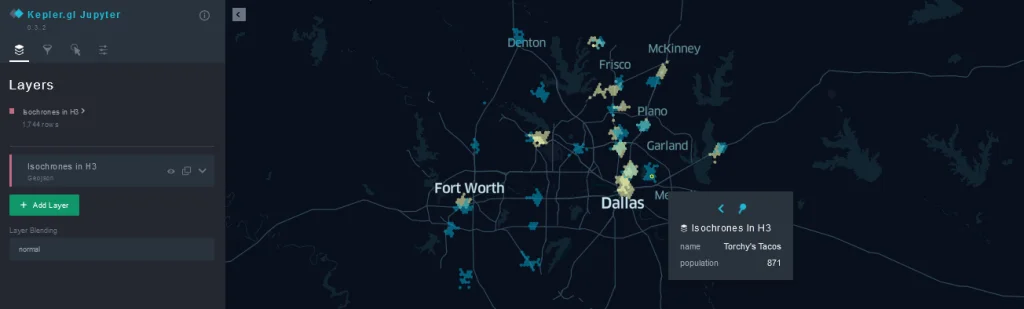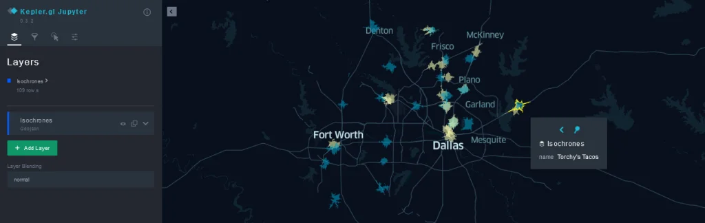 map_isochrones = sedona.read.option('header','true').format('csv'). \\ load('s3://path/drivetimes_5_min_torchys_velvet.csv') isochrone_map = SedonaKepler.create_map(map_isochrones, "Isochrones", config = isochrone_map_cfg)