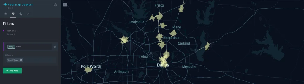Now, we need to retrieve the locations of Torchy’s Tacos and Velvet Taco locations. In general, one can do this via a variety of both free and paid means. We will look at a simple, free approach that is made possible by the integration of Overture Maps data into the Wherobots environment: