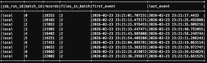 df.groupBy("job_run_id", "batch_id").agg( F.count("*").alias("records"), F.countDistinct("source_file").alias("files_in_batch"), F.min("timestamp").alias("first_event"), F.max("timestamp").alias("last_event"), ).orderBy("job_run_id", "batch_id").show(50, truncate=False)