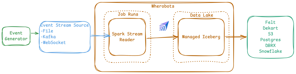 The generator that produces the Parquet files is a separate concern; any system that drops Parquet into S3 works. We’re focused on the Wherobots side: how you consume, transform, and catalog streaming spatial data.