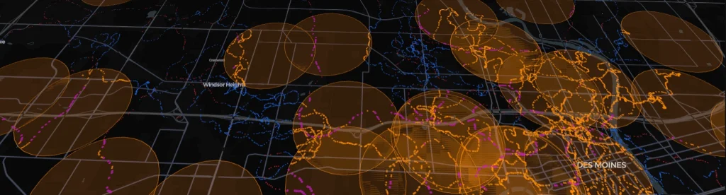 import pydeck as pdk geofence_layer = pdk.Layer( "PolygonLayer", data=geofence_pdf, get_polygon="coordinates", get_fill_color=[255, 140, 0, 40], get_line_color=[255, 140, 0, 160], get_line_width=2, pickable=True, ) points_layer = pdk.Layer( "ScatterplotLayer", data=sample_pdf, get_position=["x", "y"], get_fill_color=["color_r", "color_g", "color_b", 180], get_radius="radius", pickable=True, auto_highlight=True, ) deck = pdk.Deck( layers=[geofence_layer, points_layer], initial_view_state=pdk.ViewState(latitude=41.9, longitude=-93.4, zoom=6.5), tooltip={ "text": "{asset_id} ({asset_type})\\n{operator_name}\\nSpeed: {speed_mph} mph\\nSpeeding: {is_speeding}\\nIn Fence: {in_fence}\\nBatch: {batch_id}" }, map_style="<https://basemaps.cartocdn.com/gl/dark-matter-gl-style/style.json>", ) deck.show()