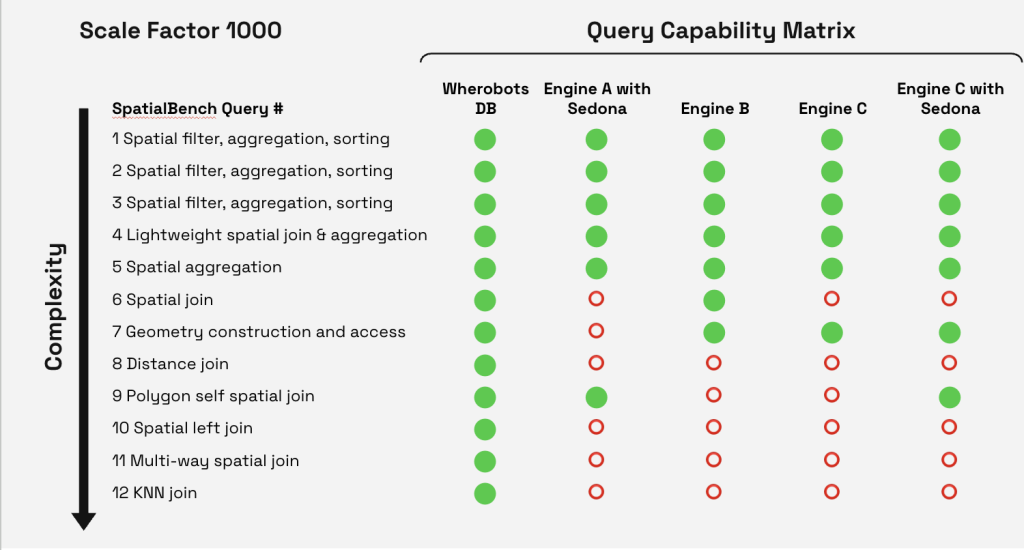 WherobotsDB is 3x faster with up to 45% better price performance Posted on March 11, 2026March 23, 2026 by Damian Today we are announcing the next generation of WherobotsDB, the Apache Sedona and Spark 4 compatible engine, is now generally available. Compared to the the previous generation of WherobotsDB, this next gen (now the current) architecture and version accelerates queries by up to 3x, with up to 45% better price-performance. Previously in preview, it is now offered through the latest version of WherobotsDB. How Customers Use WherobotsDB Our customers are using WherobotsDB to create insights from spatial data at scale that result in improved products, services, and decision making in the physical world. They are realizing breakthroughs in fleet operations, improving their risk projections, increasing the accuracy of vegetative forecasts, analyzing change, and overall are more capable of innovating against physical world interests. With Wherobots on AWS, not only can we easily scale to millions of acres and continuous tractor telemetry normalization within LeafLake, but also we can rest assured that our costs won’t spiral out of control. — G. Bailey Stockdale CEO, Leaf Agriculture The workloads customers run or want to run, are becoming more ambitious too. Customers and AI alike demand better/faster/cheaper solutions for working a wide variety of raster and vector spatial datasets, and they need to fuse this data with valuable business context as well. And of course, they want to do it without scale and function limitations. WherobotsDB was always designed from the ground up to meet these needs. But solutions are now even easier to realize, because the latest version of WherobotsDB allows you to do more, faster, at a lower cost. WherobotsDB Benchmark Results: TPC-H and SpatialBench Performance The next generation of WherobotsDB delivers a substantial performance increase for both spatial and non-spatial queries. Compared to the previous engine, our benchmarking runs for of TPC-H and SpatialBench both show significant performance improvements across scale factors of 100 and 1000. Up to a 3x peak acceleration for analytical queries based on TPC-H at a scale factor of 1000. Workloads can see a nearly threefold increase in throughput. The mean observed acceleration was 1.7x. Up to a 2.5x acceleration for spatial queries and joins based on SpatialBench at a scale factor of 1000. Spatial operations, such as intersects and joins, complete significantly faster on small to massive datasets. The mean observed acceleration was 1.9x. Up to a 45% improvement in price performance. Customers can achieve more with less cost, and the added performance makes it possible for interactive workloads to downscale into smaller runtimes. Compared to the previous version of WherobotsDB, the average improvement in price performance was 25%. Price Performance vs Next Best Engine This shows the total cost of all SpatialBench queries at SF 1000 that the next best engine could finish under a timeout of 10 hours, which limited the comparison to Q1-Q5 and Q7. The remainder of the queries (Q6, Q8-Q12) could not be completed by that engine and were excluded from this analysis. The current generation of WherobotsDB is more capable and 46% lower cost than the next best engine, which is a popular Spark based serverless engine with Spatial SQL support. How the current version of WherobotsDB compares on cost to the previous, as well as the next best engine. WherobotsDB Capabilities: What No Other Engine Offers WherobotsDB is the only engine capable of meeting the following spatial data requirements that customers have. You get: ✅ high performance, cost efficient, and scalable vector, raster, tabular data operations in a unified query environment ✅ compatibility with Spark 4 and Sedona ✅ interoperability with zero-copy on lakehouses and data lakes to keep data in your control ✅ unification with RasterFlow, to easily orchestrate planetary scale inference and analytics workflows starting with raw imagery datasets The following matrix isolates the vector data processing capabilities of the next best alternatives to WherobotsDB using SpatialBench runs at a scale factor of 1000. Raster data capabilities were not compared, because WherobotsDB was the only engine in the set that supports raster data capabilities. Apache Sedona SpatialBench query capability matrix running on WherobotsDB in comparison to multiple other spark based engines. Contact us and we can share additional details, or rerun these benchmarks on an engine of your choice. WherobotsDB Architecture: Rust-Native, Arrow-Columnar Execution The original architecture for WherobotsDB was built on a JVM-based execution model. It is an extraordinary platform for distributed computing, but its row-oriented execution model and JVM memory management introduce overhead that compounds at scale, especially for spatial-heavy workloads where every row carries complex spatial objects that must be serialized, deserialized, and processed one at a time. The new WherobotsDB version is built on a new architecture that addresses these bottlenecks by replacing the JVM-based execution layer with a Rust-native, Arrow-columnar engine, optimized for spatial data executions. Native Spatial Execution with SedonaDB The latest version of WherobotsDB takes advantage of SedonaDB, an open-source, blazing-fast analytical database engine where geospatial data is the first-class citizen. The use of Rust and SedonaDB allowed us to move spatial logic out of the JVM and directly onto the native execution layer. It provides a unified execution model that supports everything from scalar and window functions to complex spatial joins, aggregations, and geometry operations. Apache DataFusion Integration Apache DataFusion is a Rust-native query engine built from the ground up on the Apache Arrow in-memory columnar format. By integrating DataFusion’s native execution with WherobotsDB’s distribu