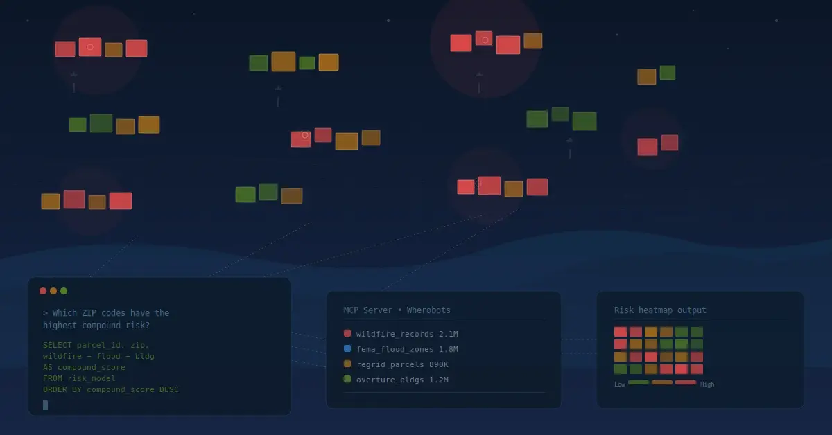 We’ll tackle one of the most time-consuming questions in underwriting: compound property risk at scale. Using the Wherobots MCP in VS Code, we go from a natural language question to a weighted risk model, a scheduled monthly pipeline, and a live risk heatmap, without leaving the editor.